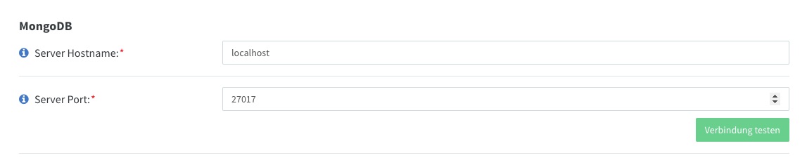 Mongo ist die Datenbank, die vom ControlCenter verwendet wird. Diese Einstellung steuert den Hostnamen und den Port des MongoDB-Servers. Die Vorgabe ist hier localhost und der Port 27017.