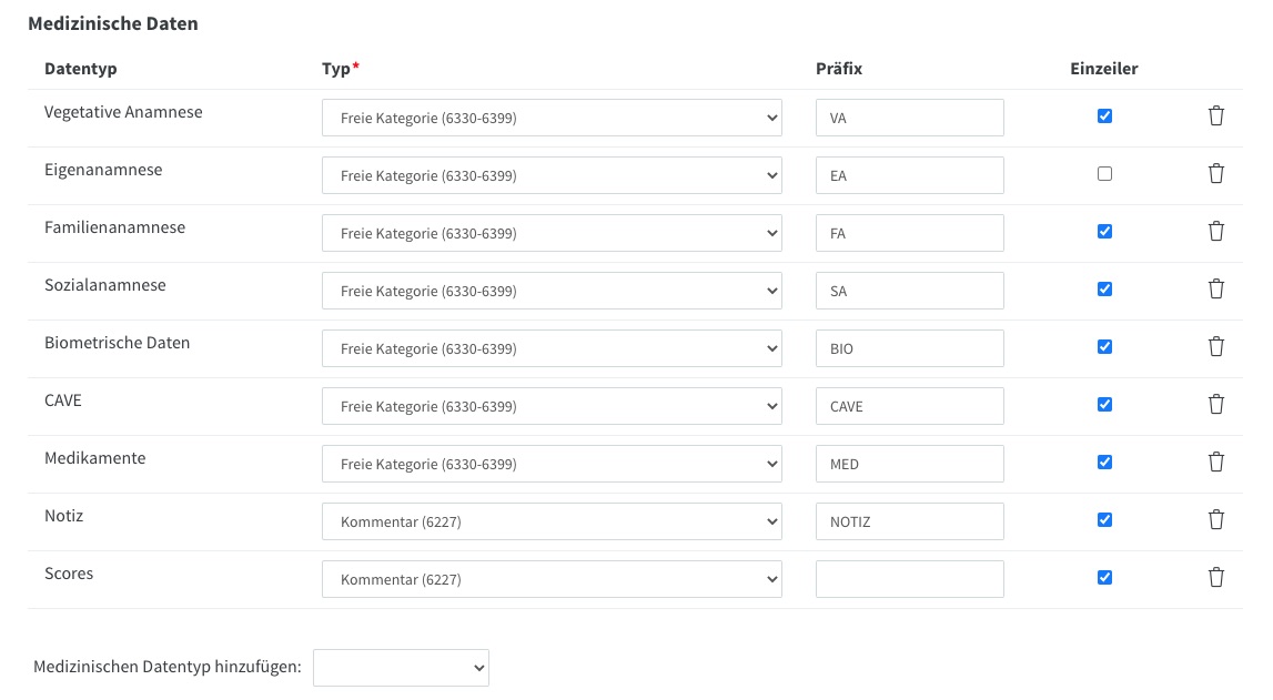 Daten aus den auszufüllenden Dokumenten können in strukturierter Form an das angeschlossene System übertragen werden. Alle Daten sind jeweils einem Datentyp zugeordnet, z. B. Notiz, Familienanamnese oder CAVE.