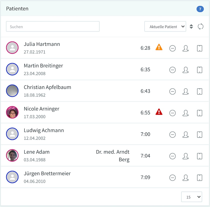 Sie können die Reihenfolge der Patienten in dieser Liste auch manuell ändern. Halten Sie dafür die Maustaste gedrückt, nachdem Sie den Avatar angeklickt haben und bewegen Sie den Eintrag nach oben bzw. unten an die gewünschte Position.
